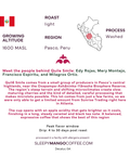 Grown in the highlands of Pasco, Peru, this microlot reflects the careful work of smallholder producers farming near the Oxapampa–Asháninka–Yánesha Biosphere Reserve. The cup opens with soft acidity and a smooth body, bringing out notes of guava and apple that become more pronounced as it cools. A caramel base and black tea finish give this coffee a steady, lingering clarity. Limited in quantity and available for a short run.